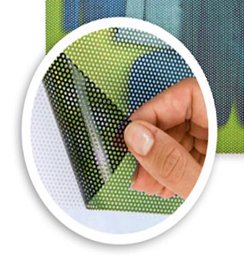 Perforierte weiße glänzende Spezial-PVC-Folie mit schwarzer Rückseite für den Einsatz auf Kfz-Scheiben (in Verbindung mit Schutzlaminat StVZO zugelassen) oder ebenen auf transparenten Substraten aus Glas. Nach dem Bedrucken der Folienvorderseite ergibt sich ein sichtbares Druckbild, wobei die perforierte schwarze Rückseite durchschaubar ist. Der Anteil der bedruckbaren Fläche gemessen an der Gesamtfläche beträgt 60%. Der geringe Lochdurchmesser von 1,5mm ermöglicht ein vergleichsweise feines Druckbild. Die Folie kann bis zu einer Breite von 148 cm produziert werden. Größere Drucke werden aus mehreren Teilen mit einer 1cm Überlappung gefertigt. Die Klebefolie (unbedruckt) ist 3 Jahre haltbar bei fachgerechter Verarbeitung und bei vertikaler Außenbewitterung (mitteleuropäisches Normalklima).